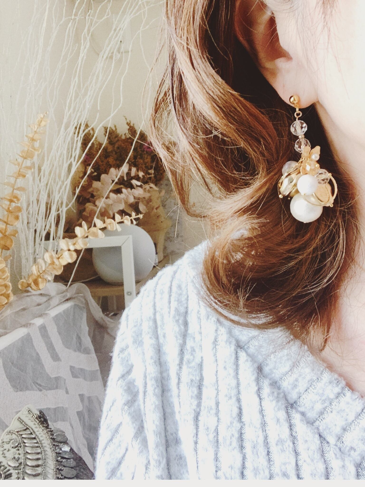 小さなお花、フープ、メタルパーツ、パールなど、7種類14個のパーツを使用し、コロンとしたフォルムが可愛らしい一品です。