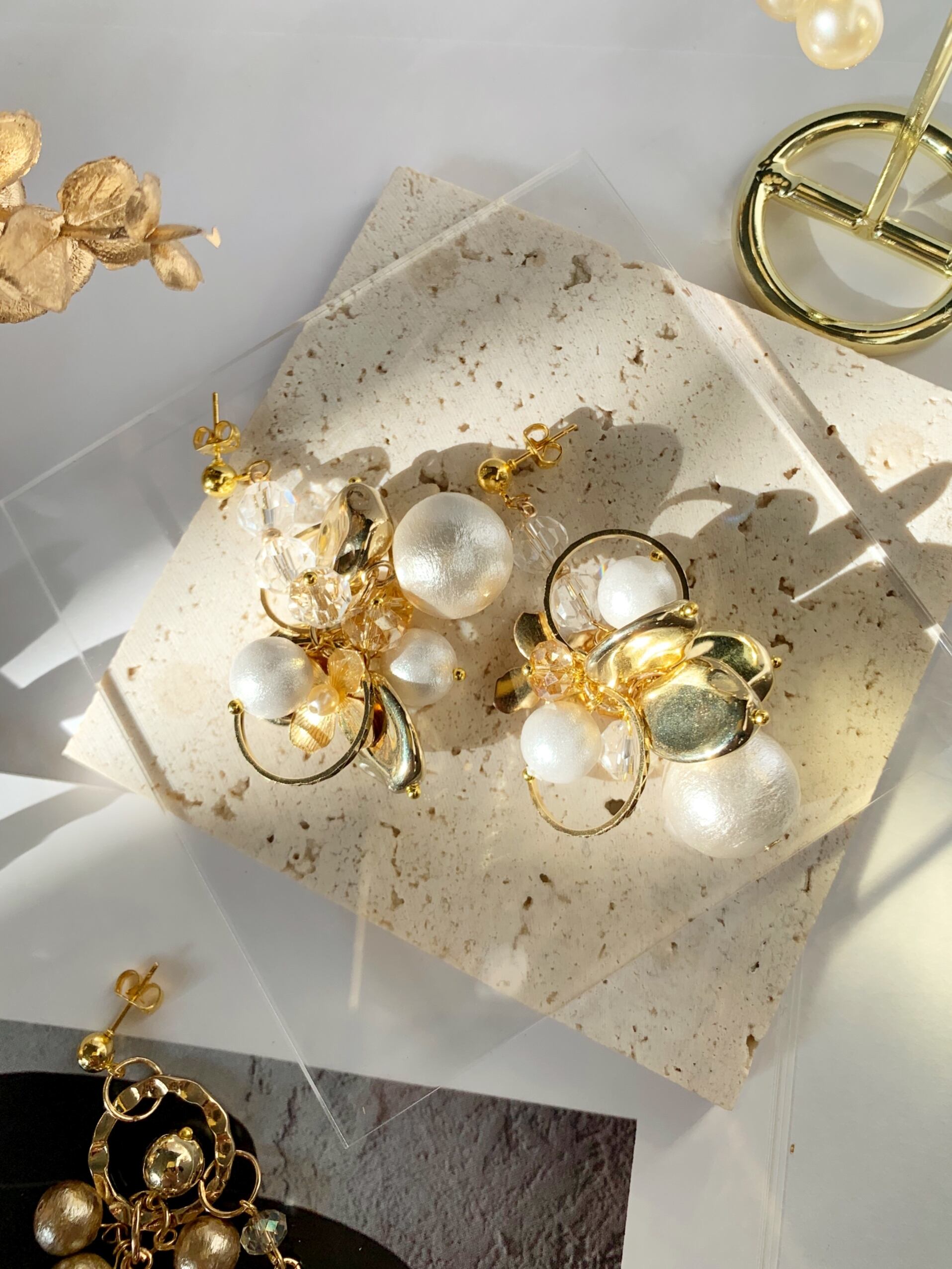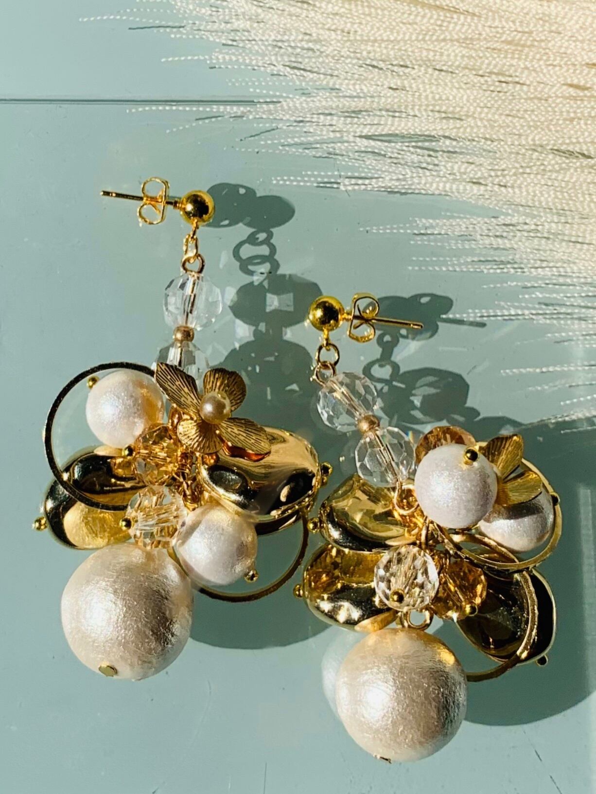 キラキラのガラスビーズが揺れる、まるでシャンデリアのようなデザインのコットンパールシャンデリアピアス。