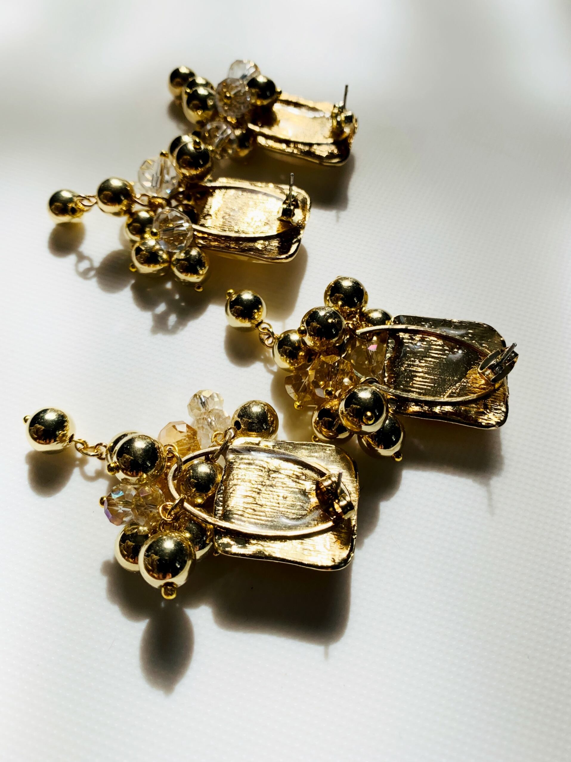 透明感ある天然石風のカボションが、ゴールドのフレームとマッチしてとてもおしゃれなデザインです。