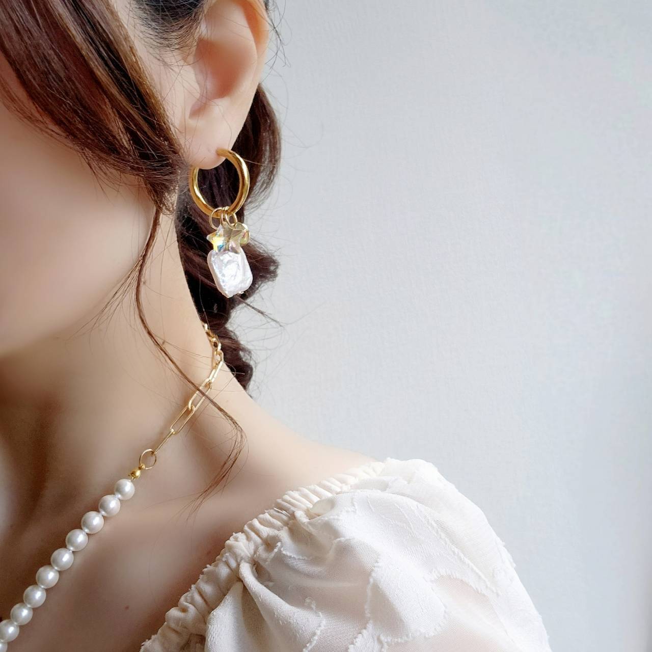 ステンレス製のハードめなフープに、淡水パールとチャームがアクセントになっています。