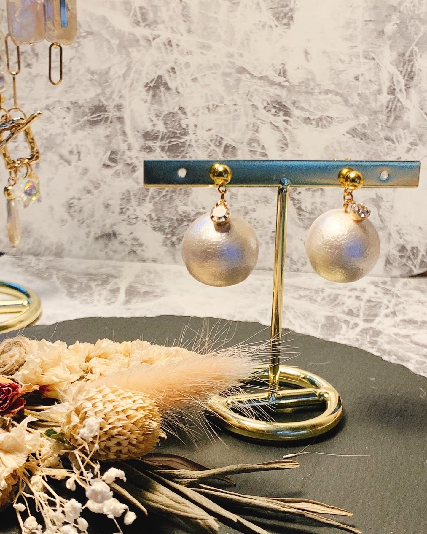 大きめのコットンパールがエレガントな印象を与える一方、シンプルなデザインでどんなファッションにもマッチします。