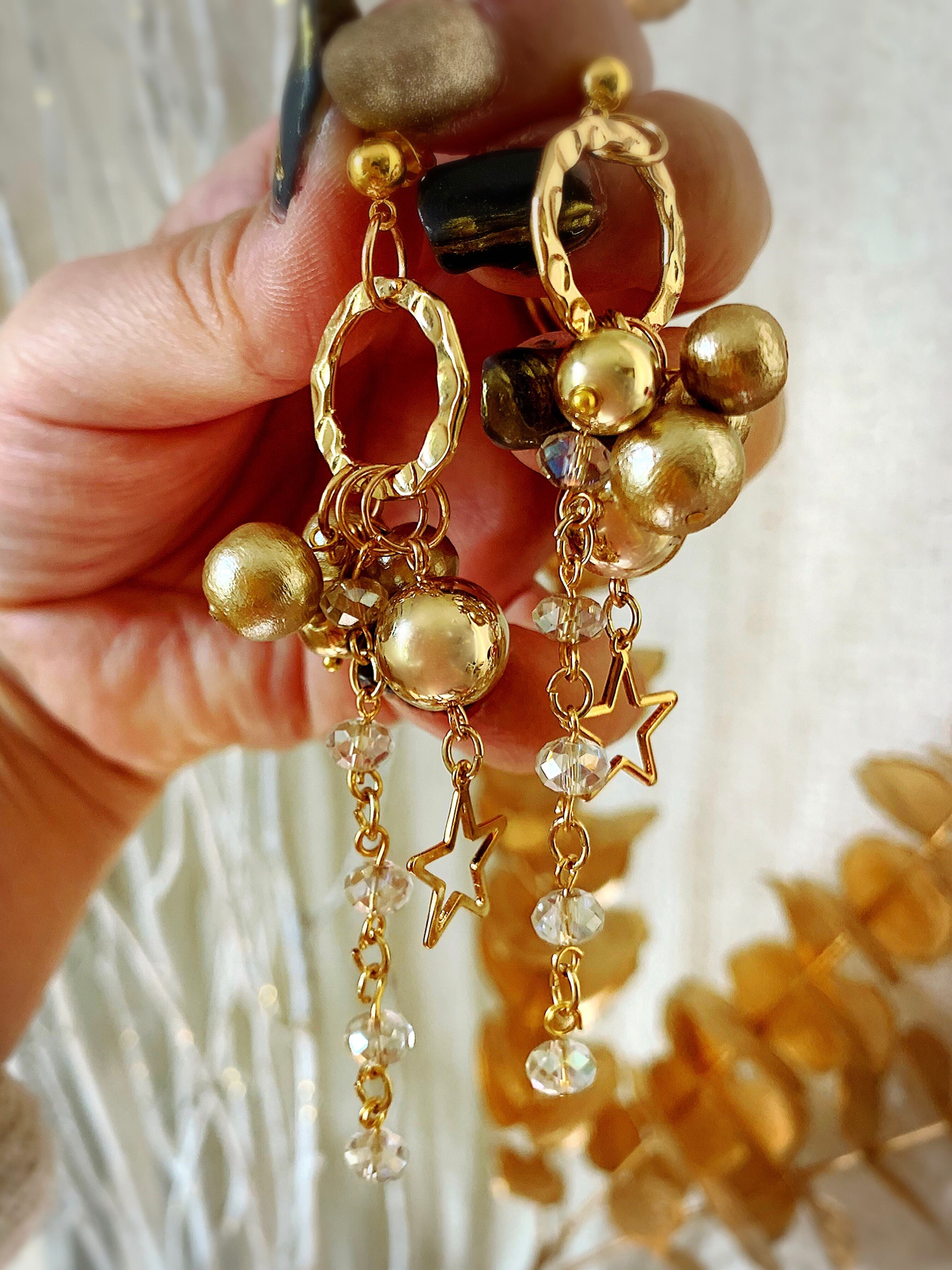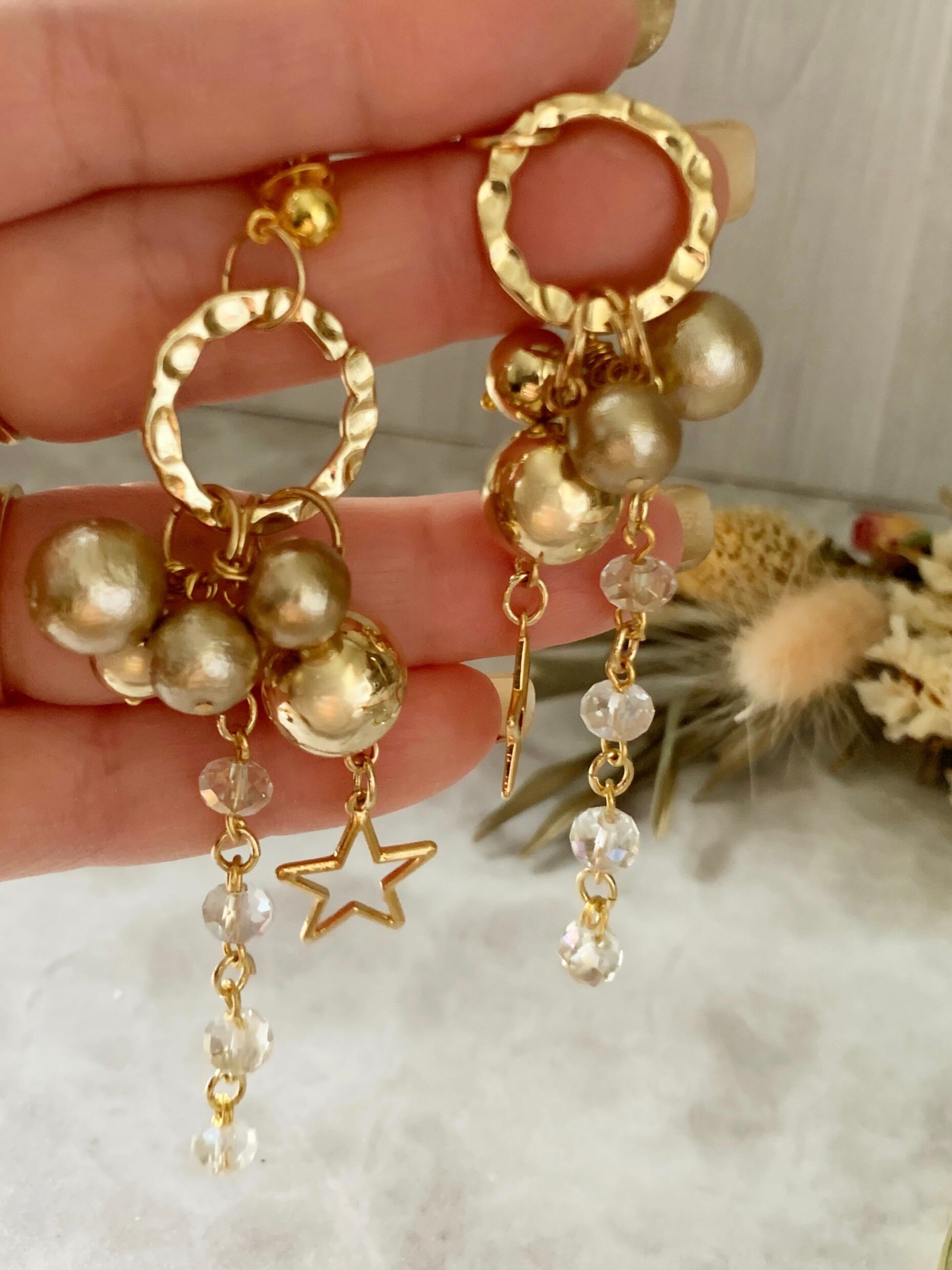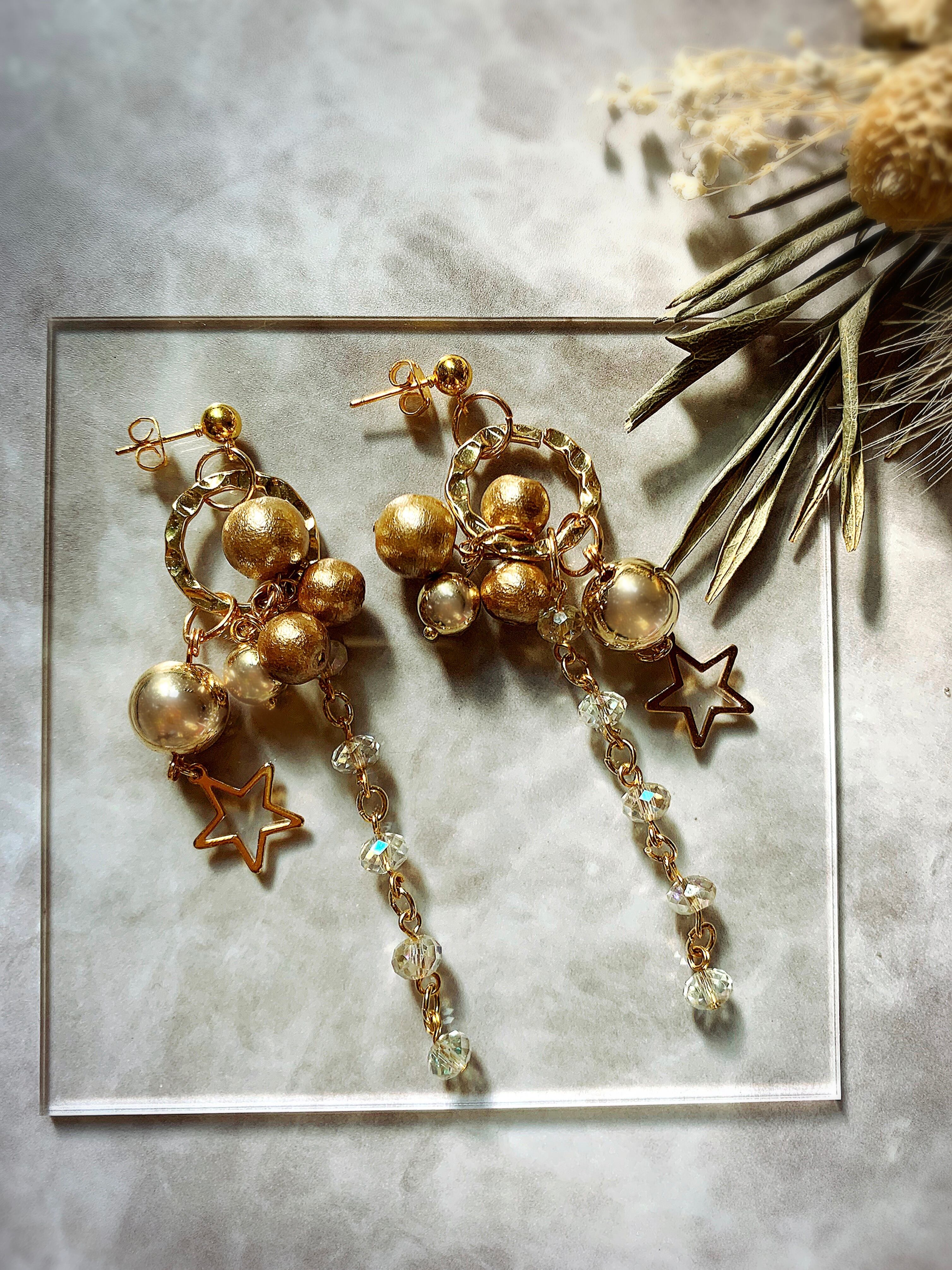 星モチーフとコットンパール、キラキラ光るガラスビーズが華やかなピアス。