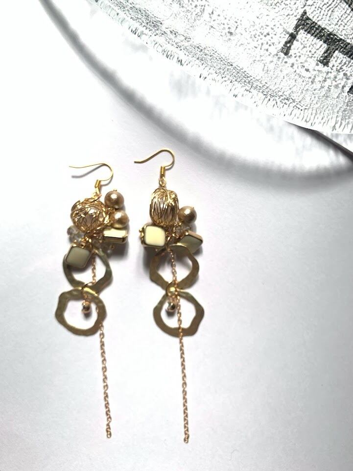 スクエアチャーム、ガラスビーズ、一粒ジルコニアをあしらい、さりげなく輝くデザインに仕上げました。