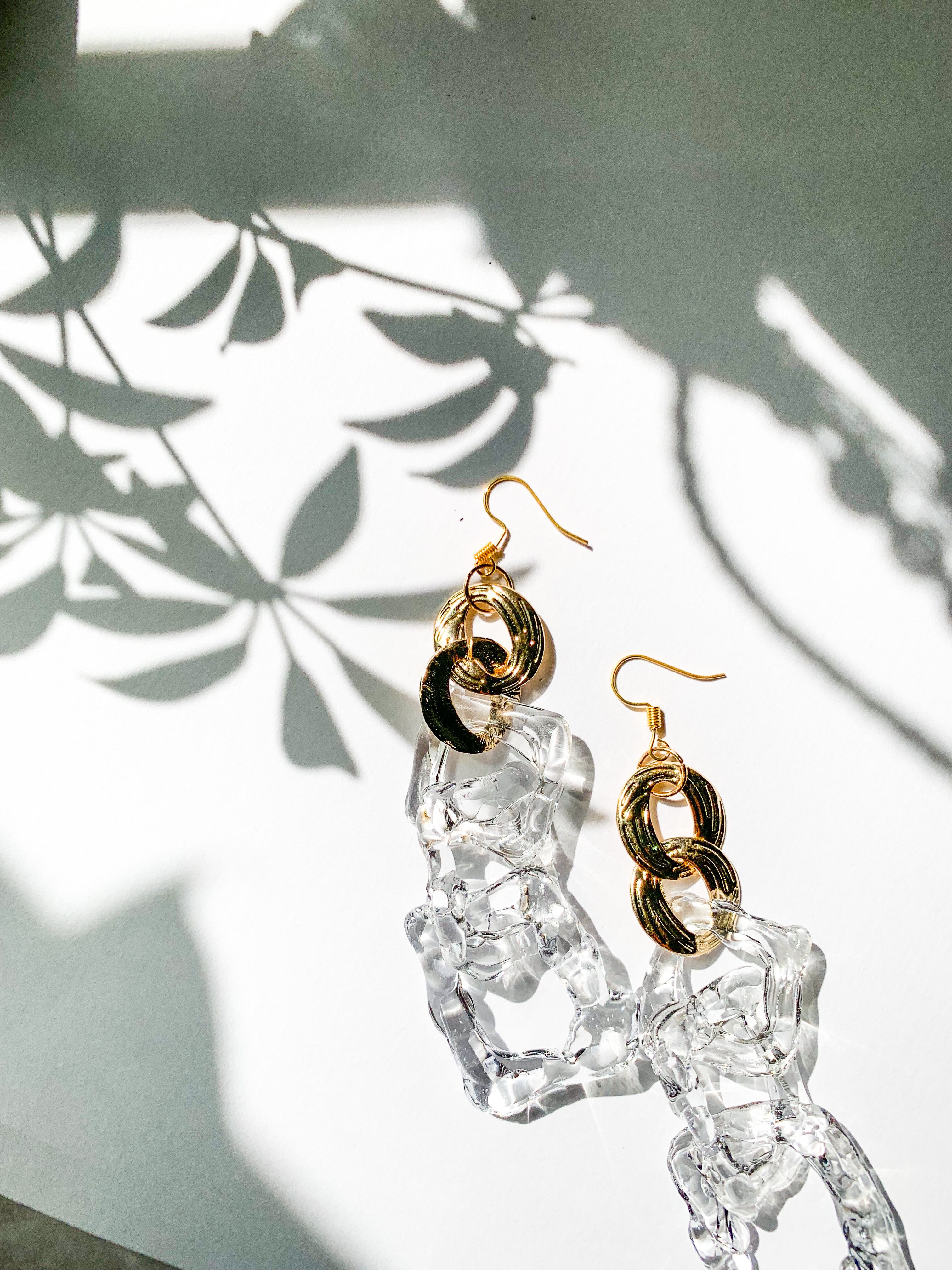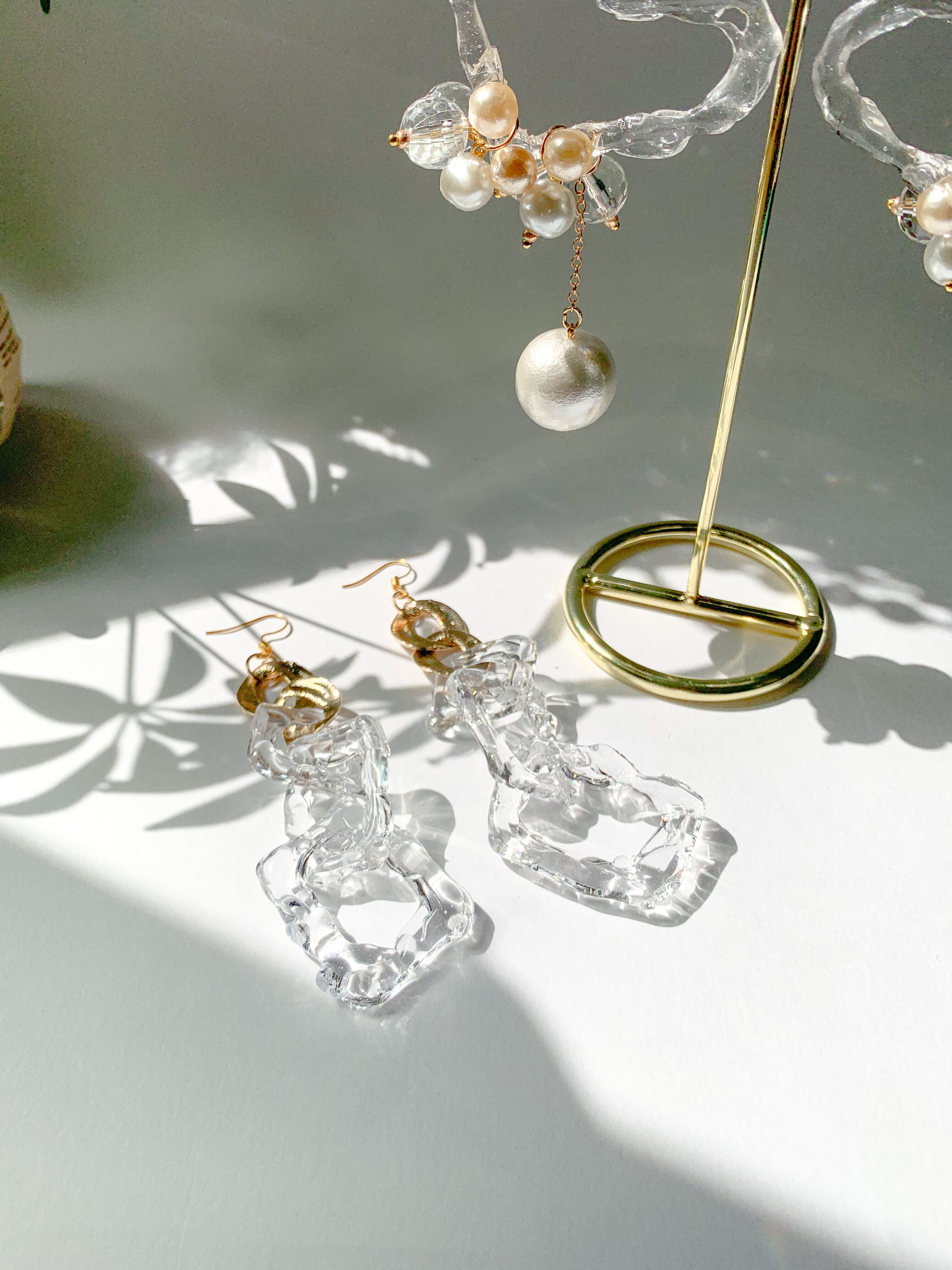 一つ一つ手作りで作られたこのピアスは、時間をかけたフリーハンドで生まれたシルエットと透明感を生かしたエレガントさが特徴です。