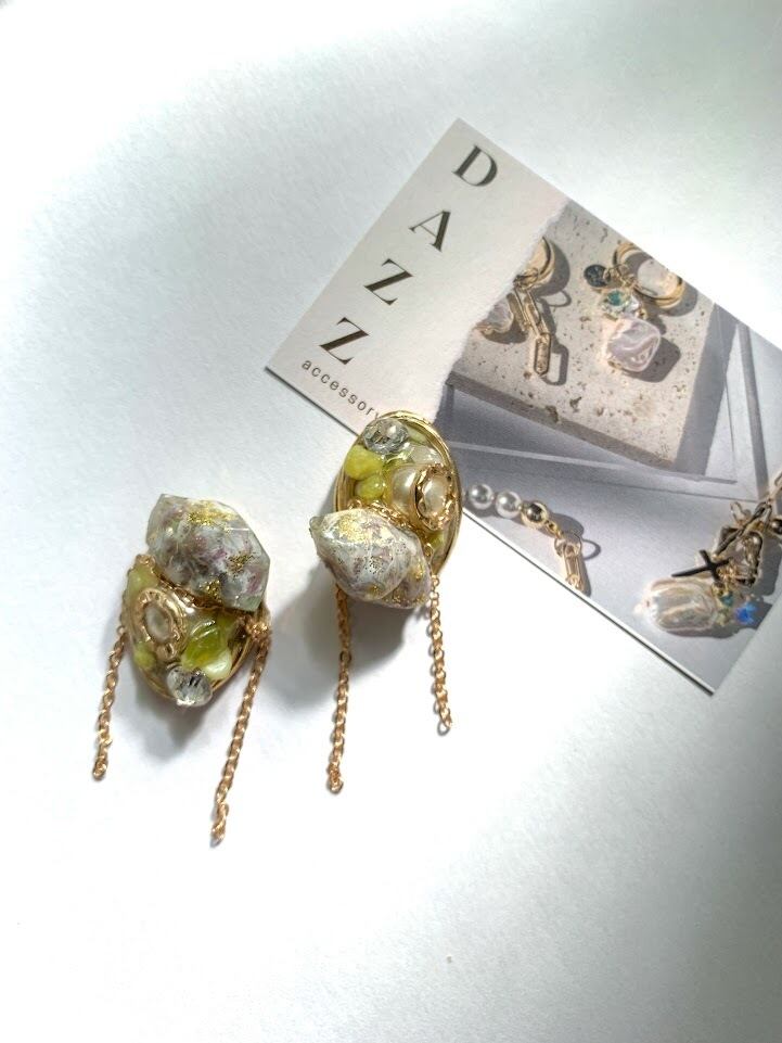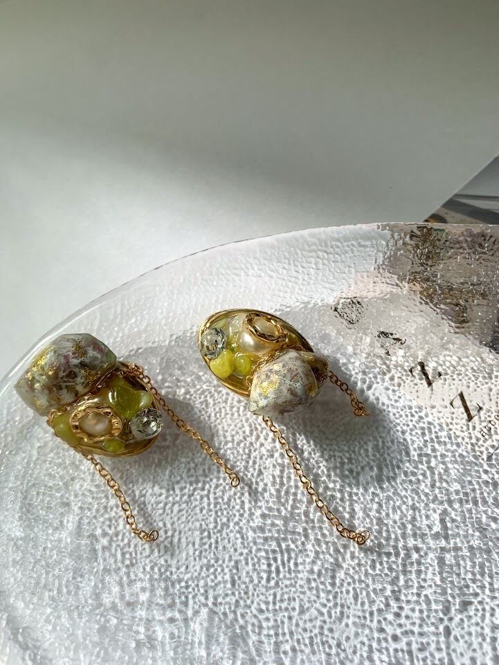 また、このピアスはレジン素材を使用しており、鉱石風のニュアンスがとても美しいんです。