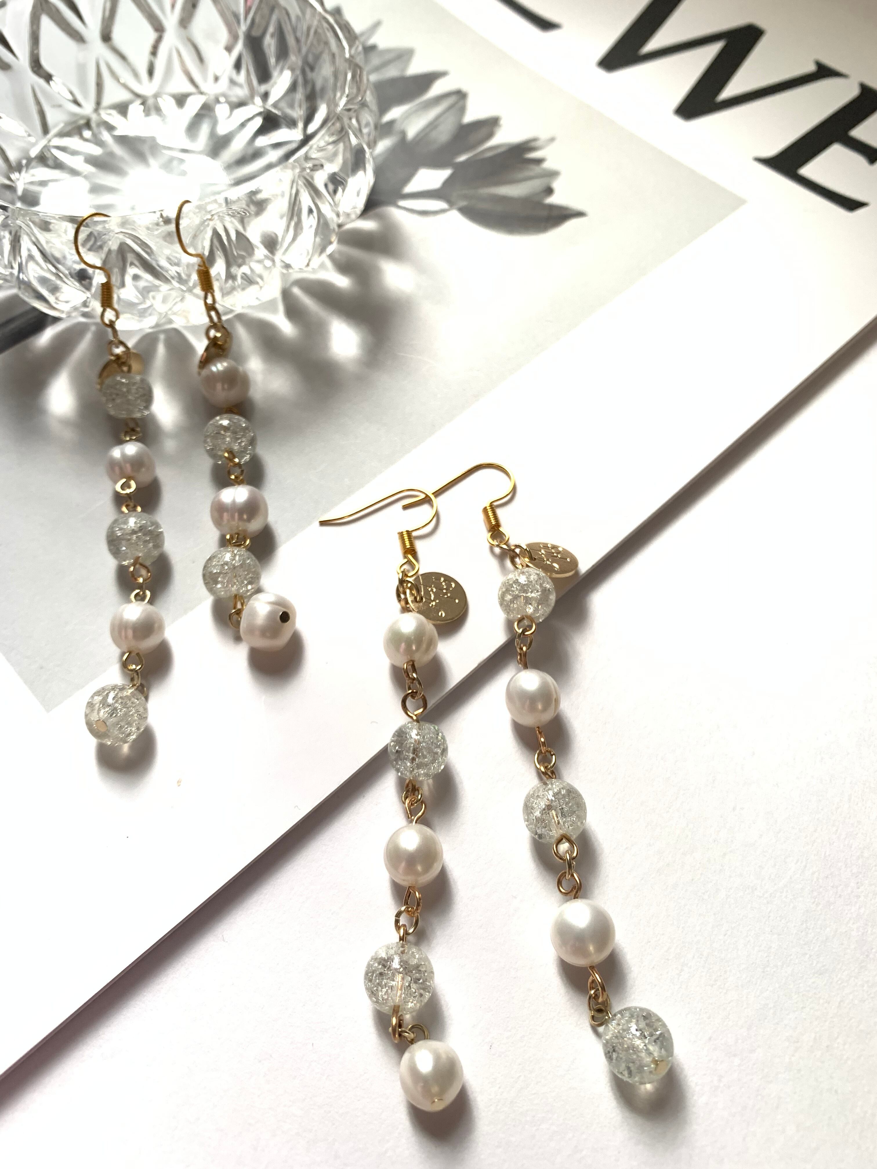 このロングデザインは、厳選された淡水パールを使用し、クラックガラスも高品質を厳選して使用して丁寧に加工しています。