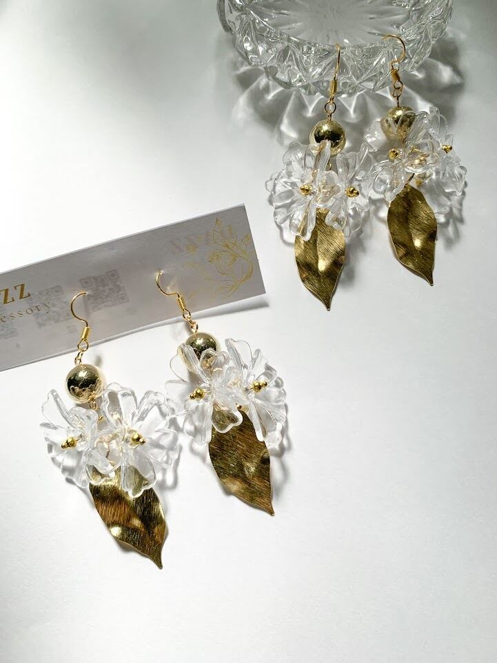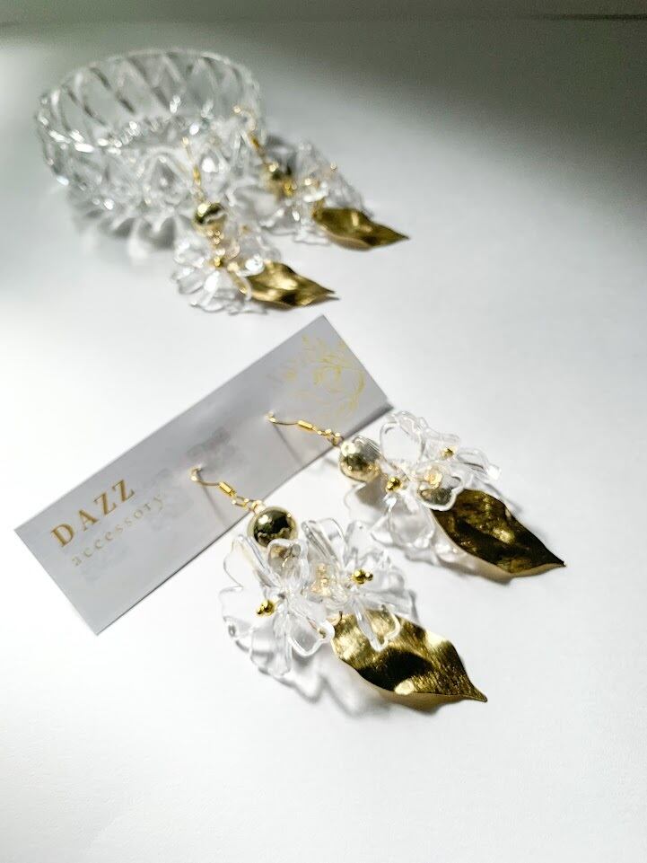 透明感のある花と輝くゴールドリーフが、女性の耳元を上品な輝きで彩ります。