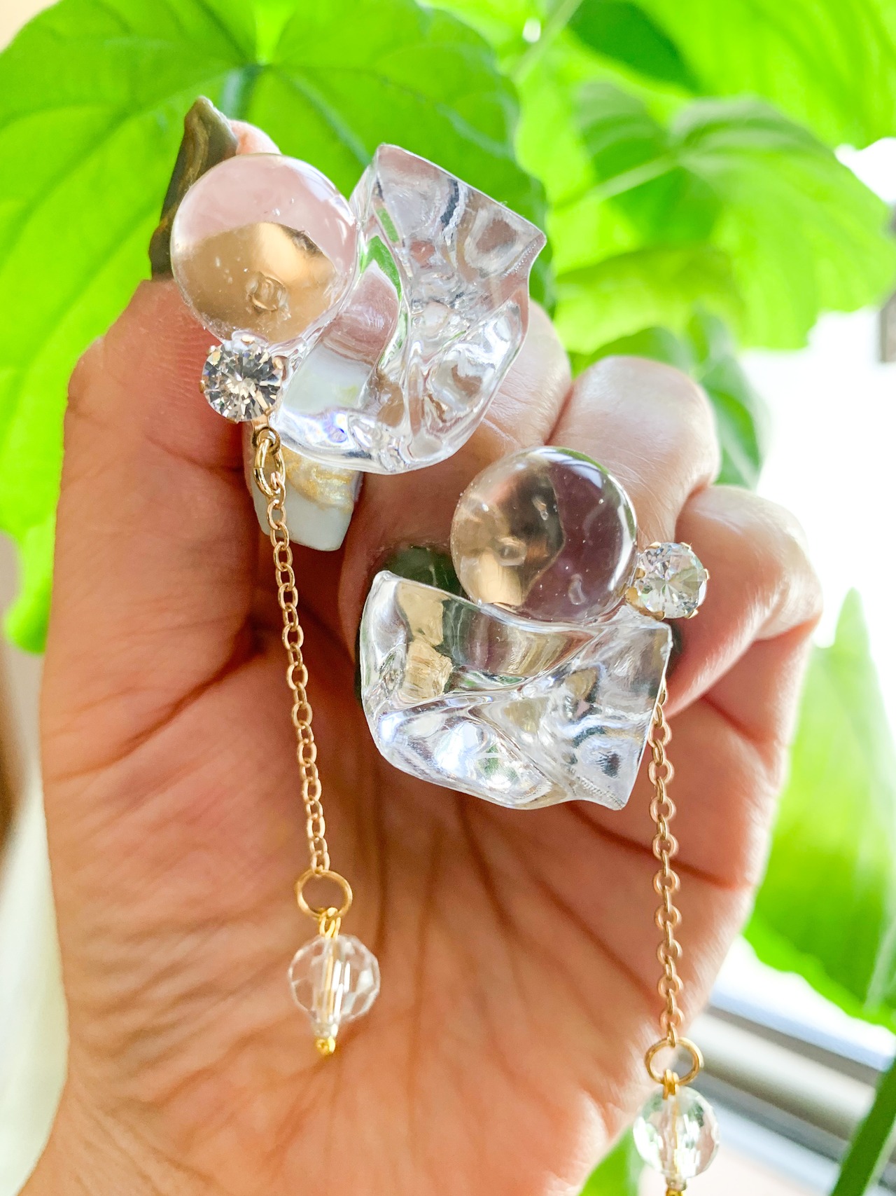 レジンの球体がキラキラと輝き、動くたび耳元で光が踊ります。