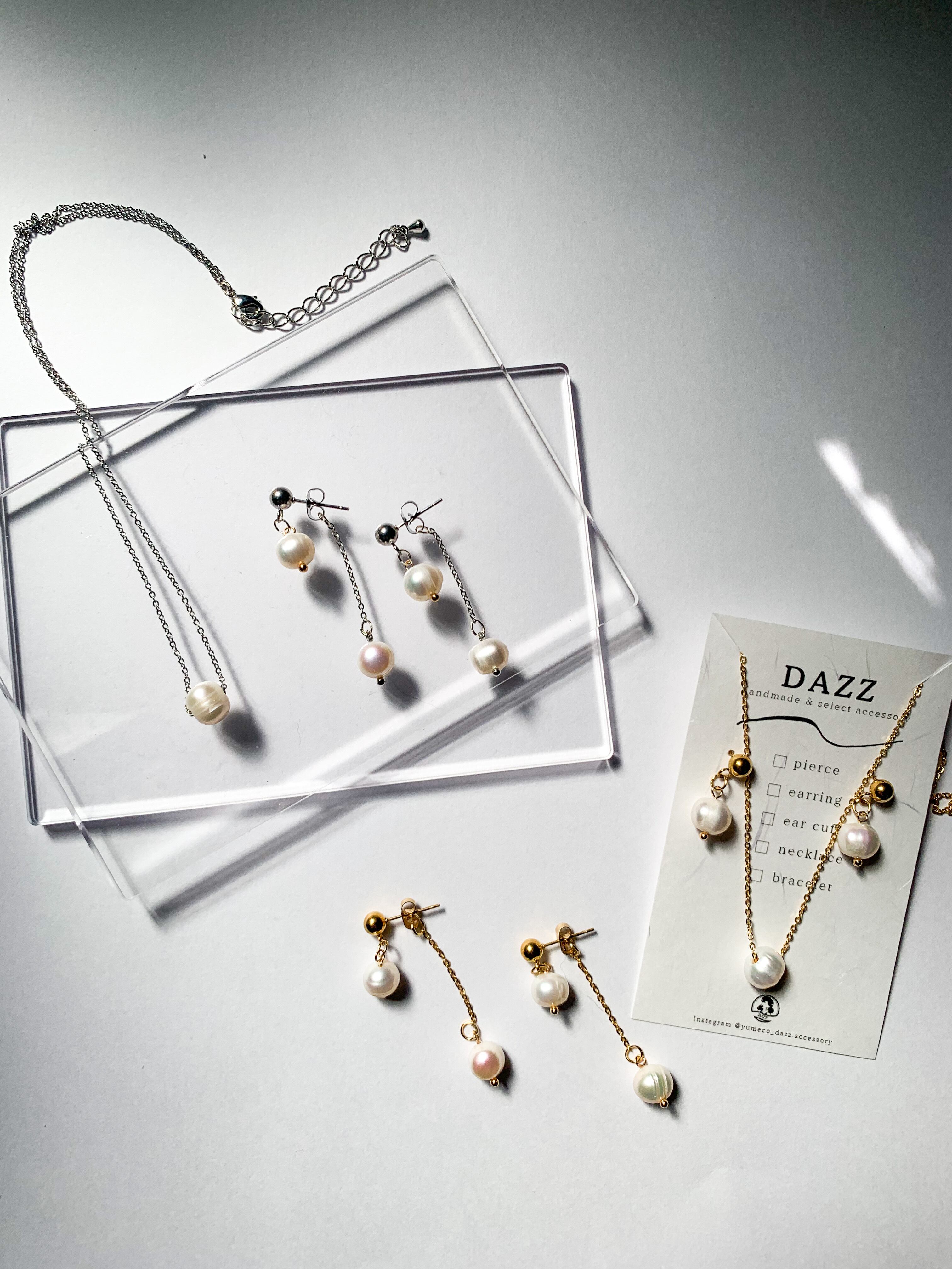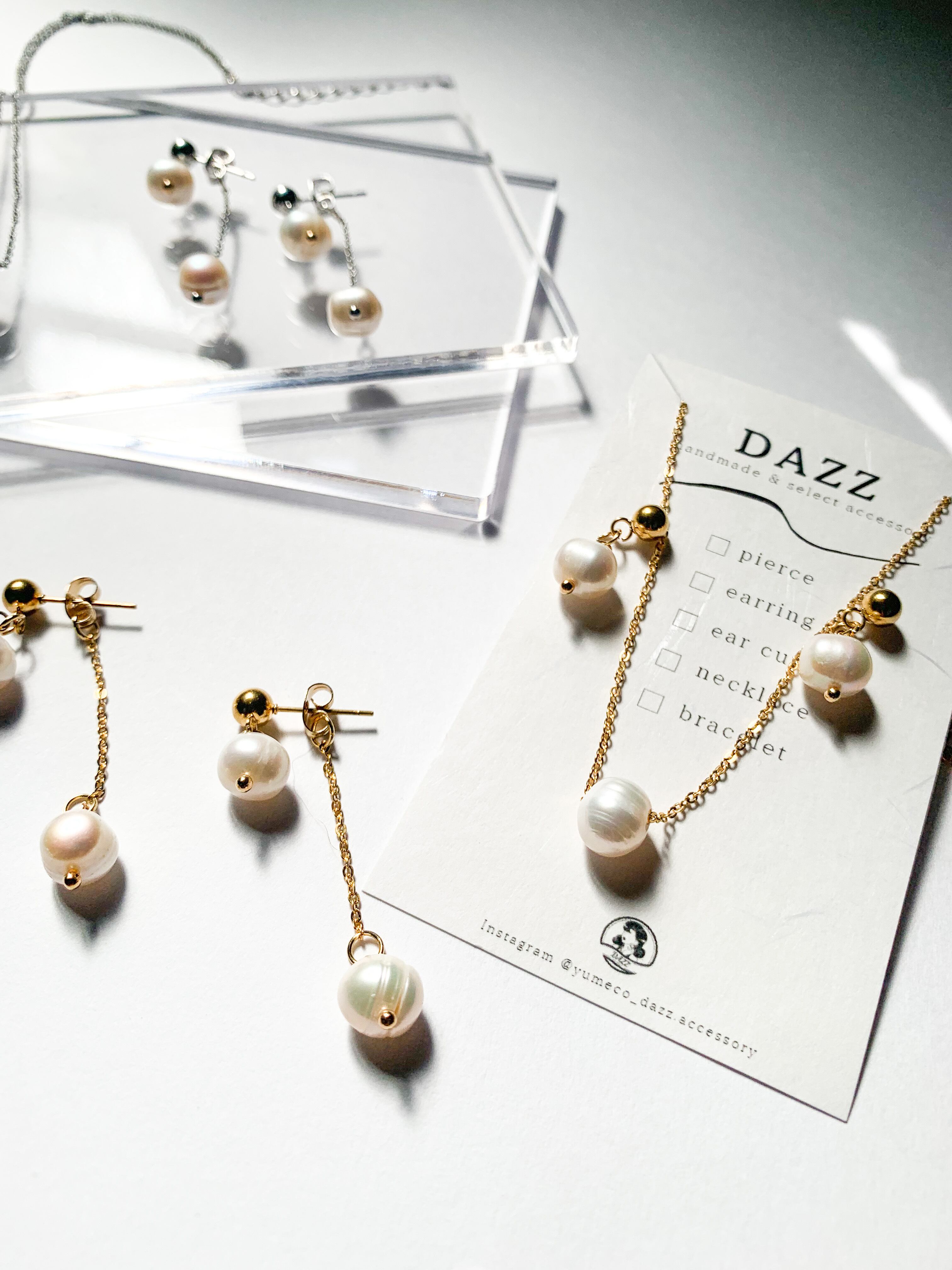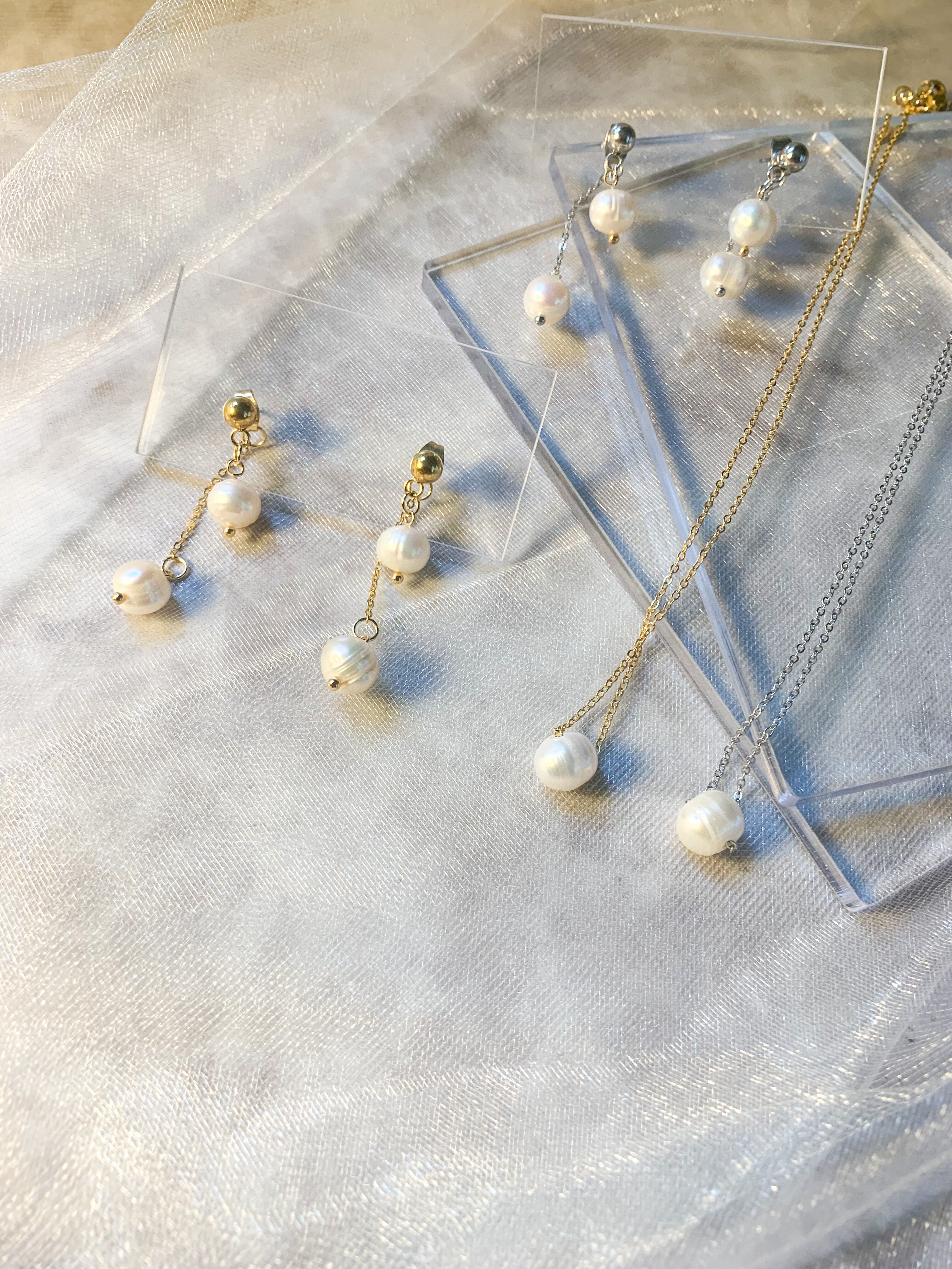 一方、ピアスも同じ淡水パールを使用した揺れるタイプ。