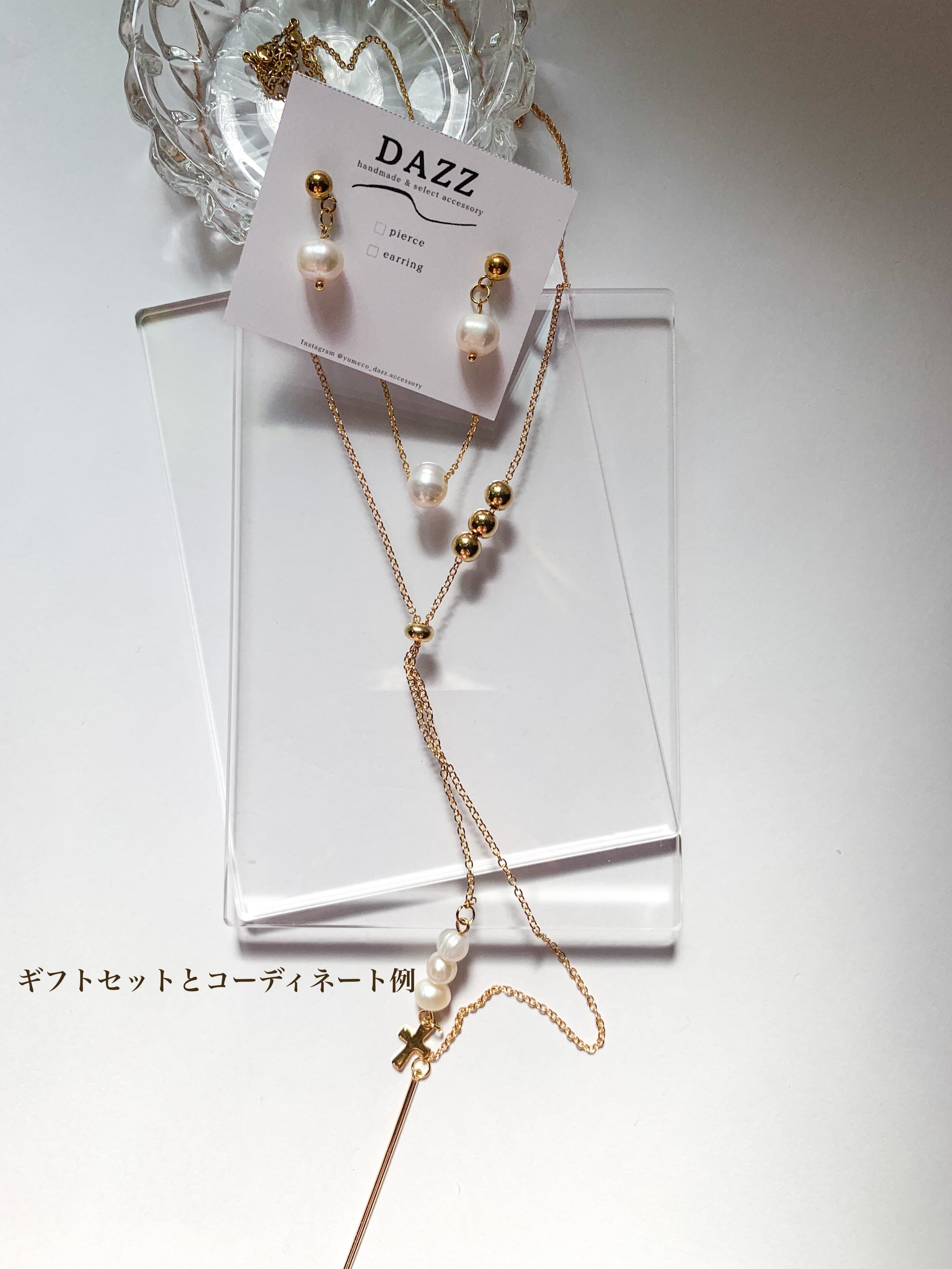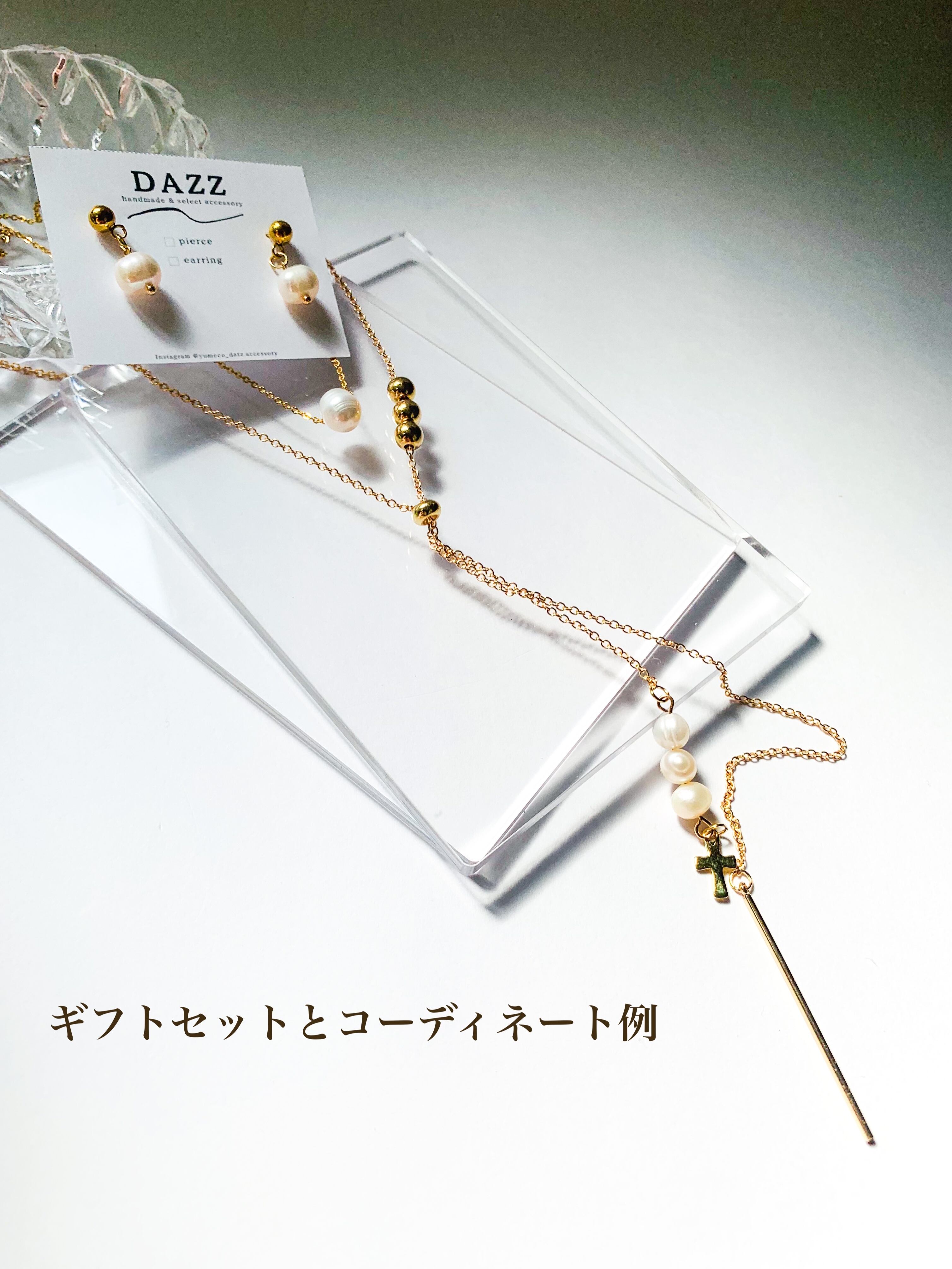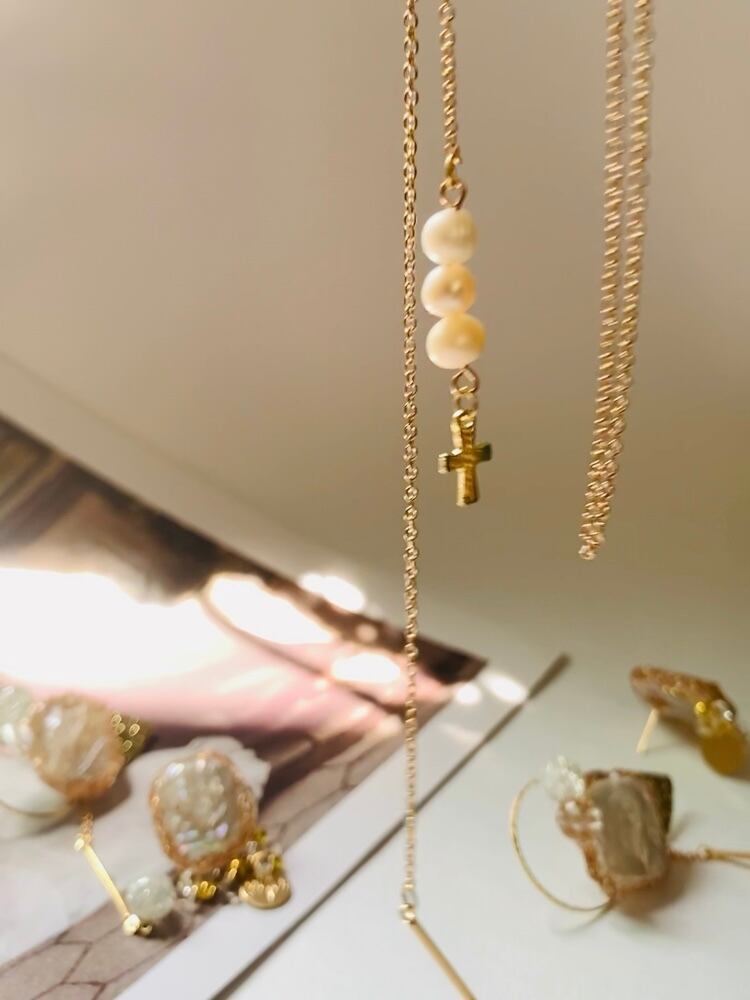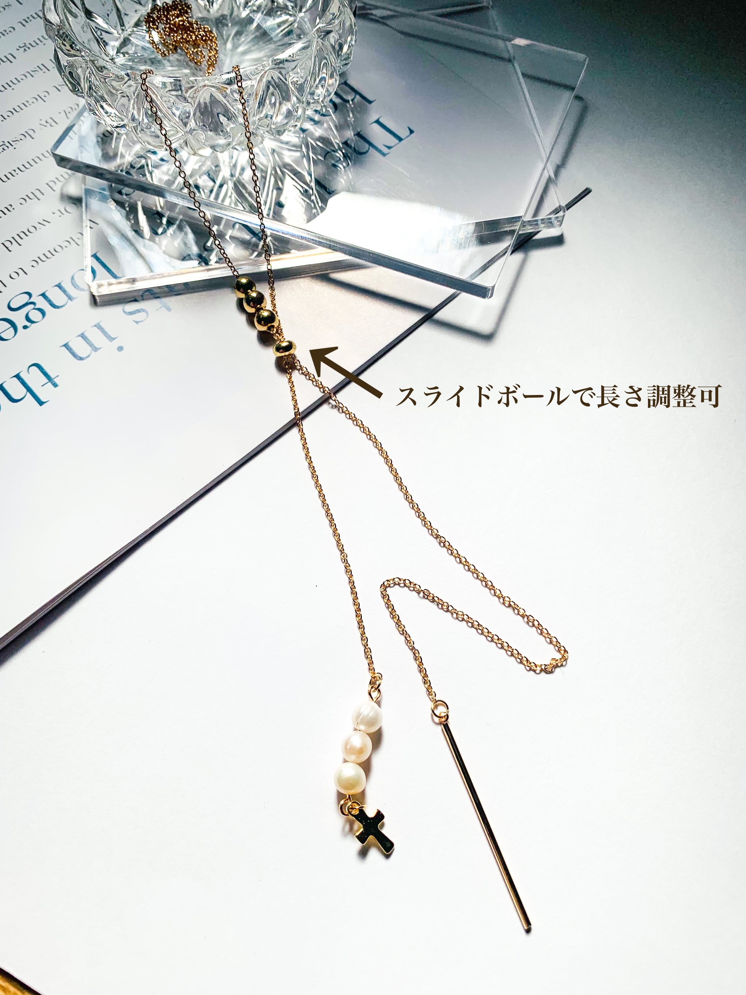 パールの下にはクロスのモチーフをあしらい、スライドボールで長さ調整が可能。