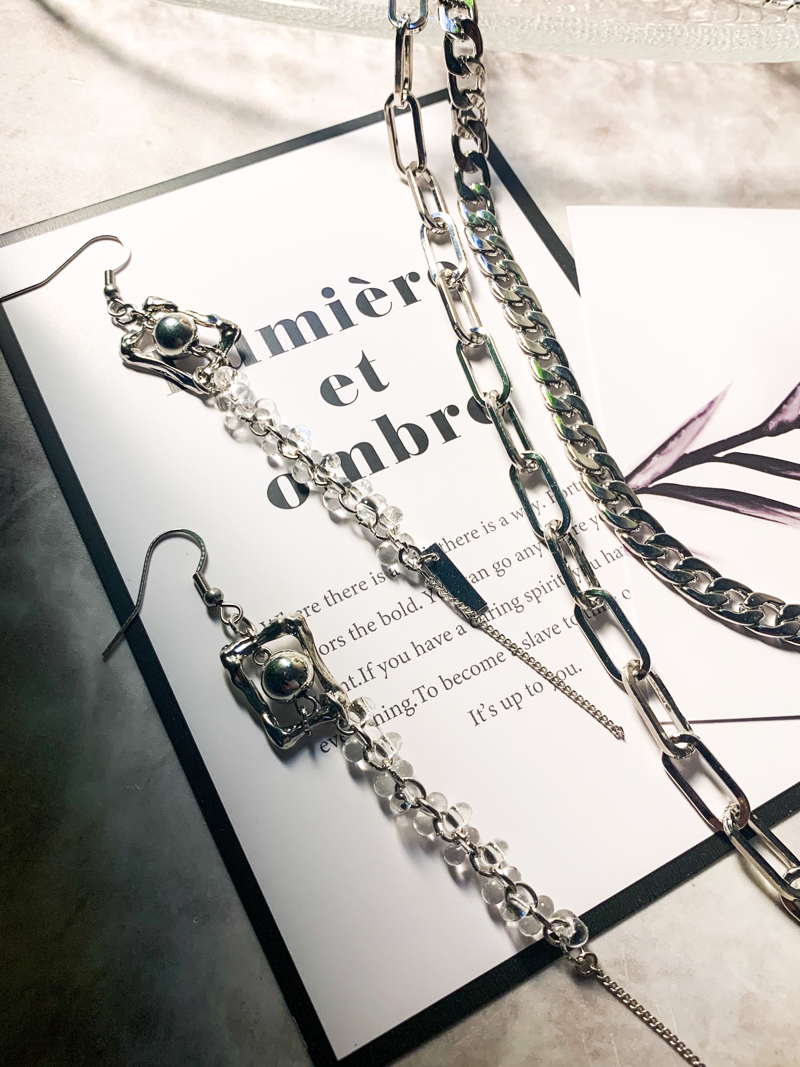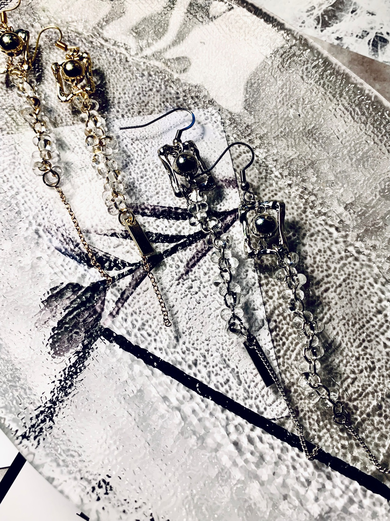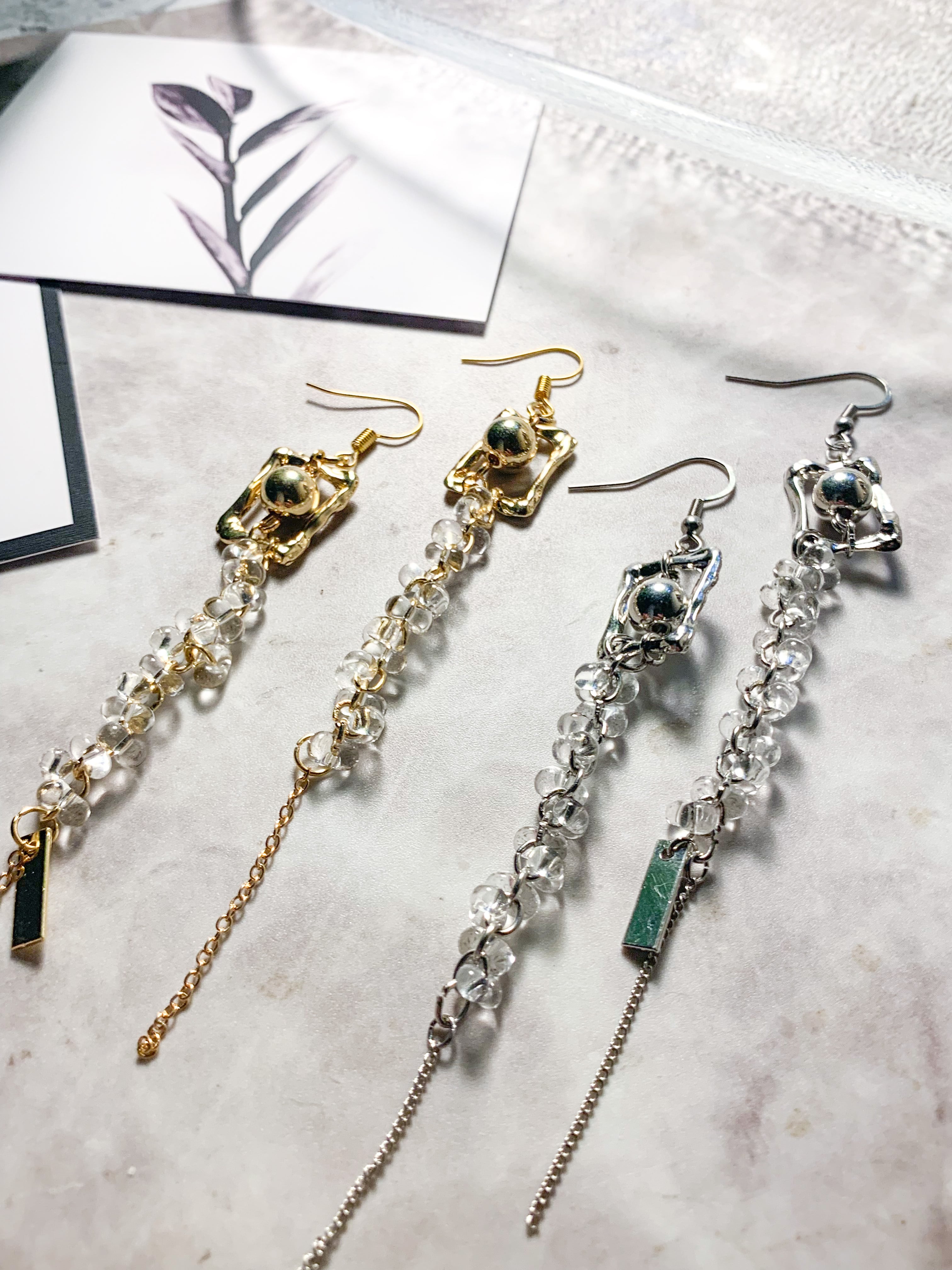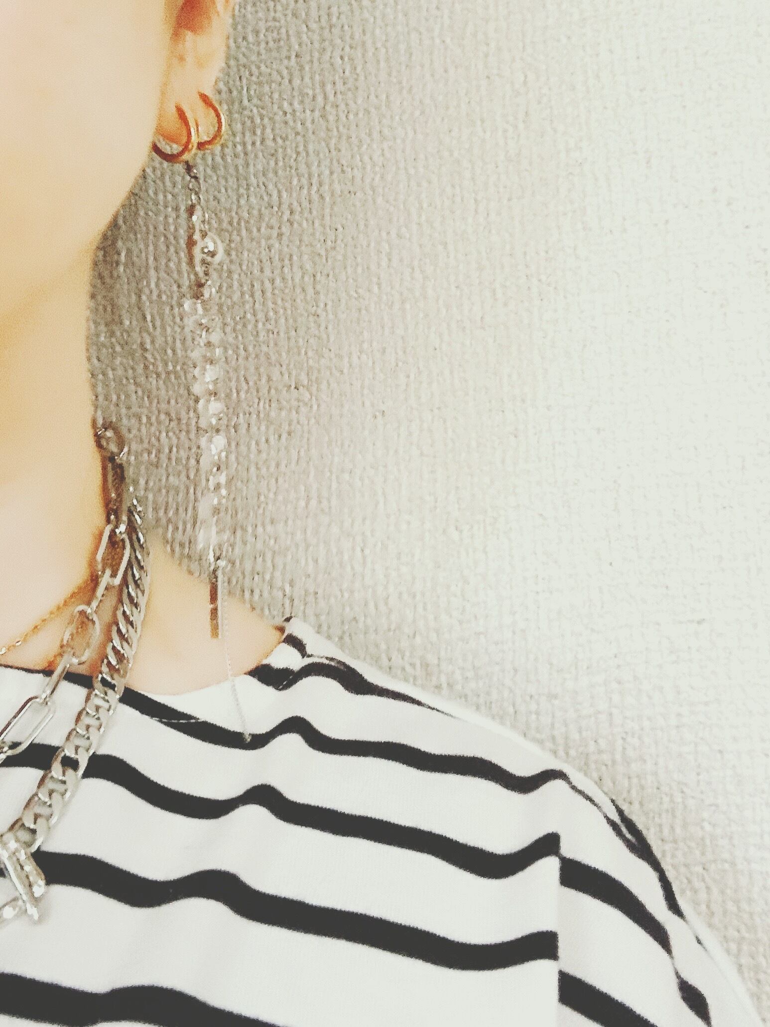 メタルパーツと小さなガラスが縦に並んだ、クールなデザイン。